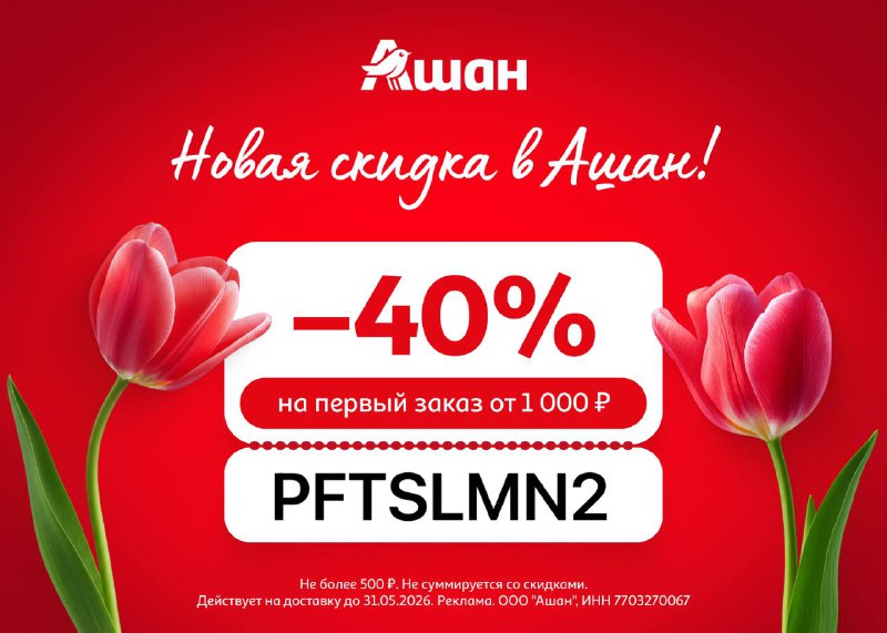 🥦Скидка 40% в Ашан 😱 На первый заказ от 1000₽ по промокоду 👉PFTSLMN2 (Действует на товары без скидок) https://auchan40.prfl.me/wowskidka1/kpxd36?erid=2RanymGPE4a Действует до 31.05.2026. Скид