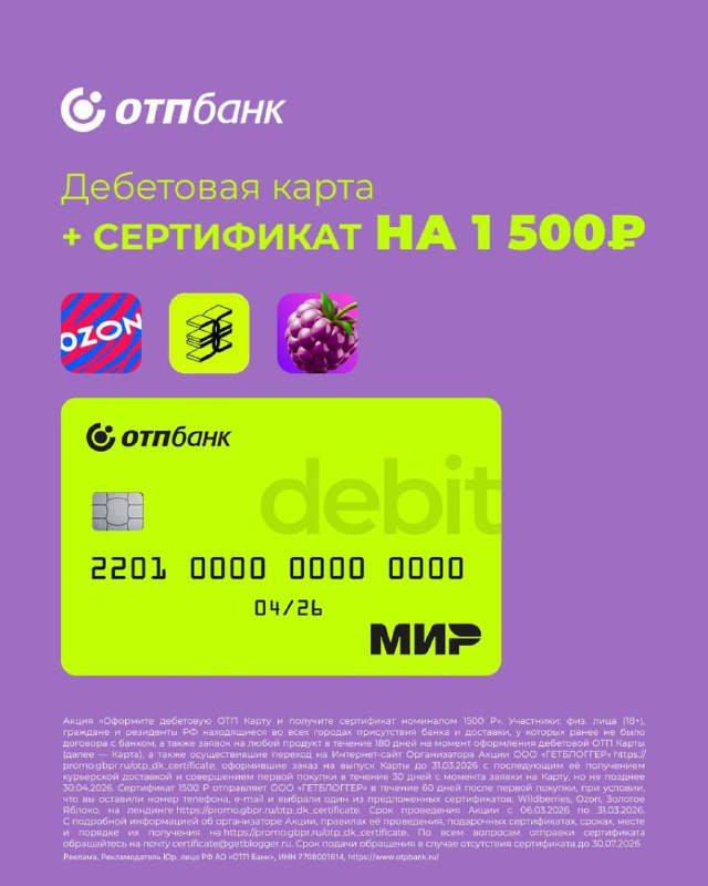 Сертификат на 1500₽ в подарок при оформлении дебетовой карты ОТП Банка ⚡️ Переходите по ссылке для выбора сертификата: https://tracking.pn.mts.ru/tracker?channelId=f3810428-7c20-4fdc-a8ab-356592a3f61