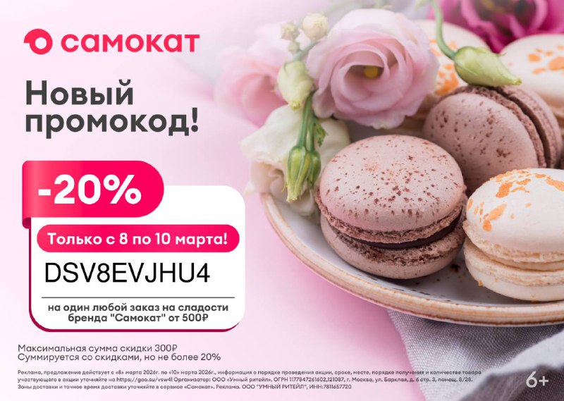 Самокат 🛴 Только до 10 марта скидка 20% на один ЛЮБОЙ заказ на сладости бренда "Самокат" от 500 ₽ по промокоду 👉DSV8EVJHU4 https://samokat.prfl.me/wowskidka1/qpzcrz?erid=2RanykGUgJe