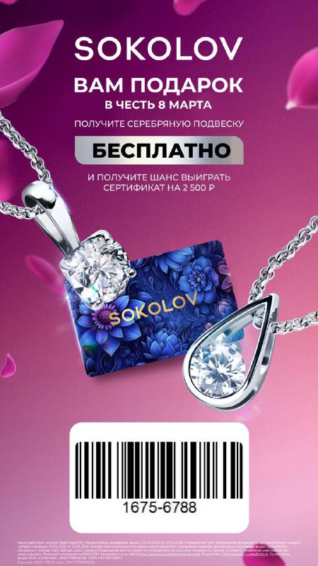 💍 Получите подвеску SOKOLOV БЕСПЛАТНО! 💍 Просто предъявите штрихкод на кассе в магазине SOKOLOV и получите стильную подвеску в подарок https://sokolov.prfl.me/wowskidka1/fxh7p8?erid=2RanynkZbkn То