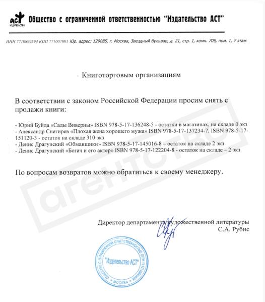 Из магазинов изъяли 26 книг «Редакции Елены Шубиной» Книжным сетям разослали письма с требованием снять с продажи 14 новых книг издательства, входящего в АСТ. Причины в новых письмах не указаны, одн