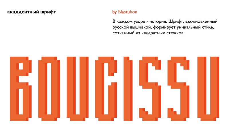 Шрифт "Boucissu" by Анастасия Маликова Акцидентный шрифт, вдохновлённый русской вышивкой, который формирует уникальный стиль из квадратных стежков. Шрифт поддерживает латиницу и кириллицу. Бесплатен