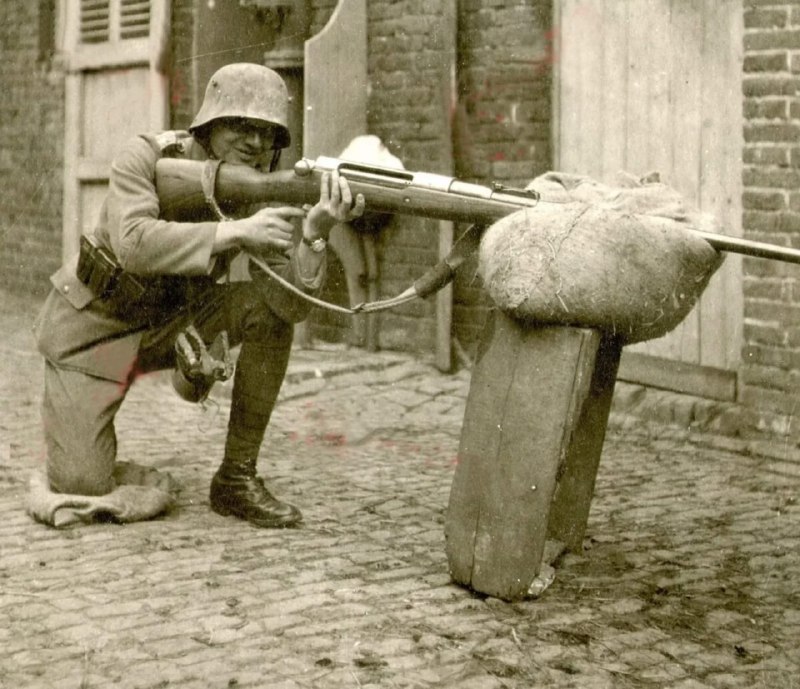 Немецкий солдат демонстрирует работу с противотанковым ружьем Mauser M1918 с импровизированным держателем, 1918 год.