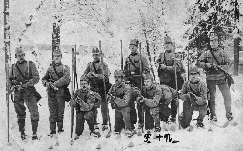 Австро-венгерский лыжный патруль чешского происхождения во время Карпатской зимней кампании 1915 года.