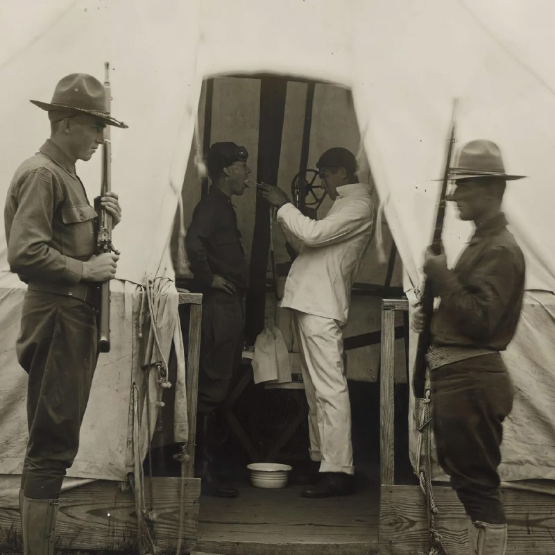 Американские солдаты охраняют палатку, а армейский врач делает солдату «вакцинацию» от испанского гриппа с помощью спрея для горла, 11 июня 1918 года. 4 марта 1918 года, в Форт-Райли, штат Канзас, СШ