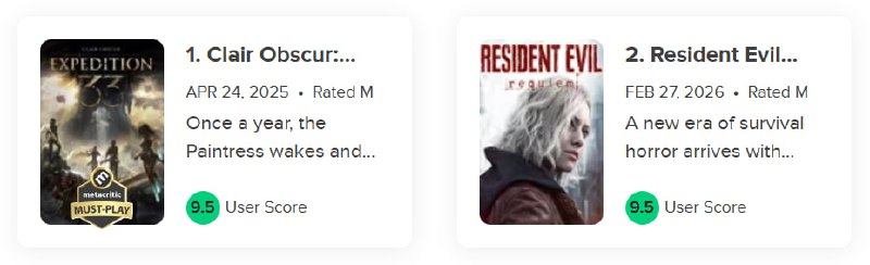 Resident Evil Requiem сравнялась с Clair Obscur: Expedition 33 по пользовательскому рейтингу на Metacritic. Обе игры сейчас имеют высочайшую оценку в 9.5 баллов из 10. Xbox News / Чат / DNS Купить и