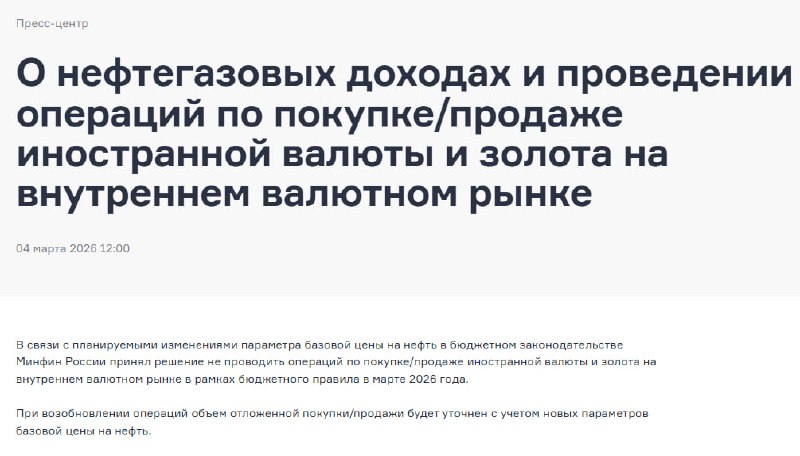 ⚡️В связи с планируемыми изменениями параметра базовой цены на нефть в бюджетном законодательстве Минфин России принял решение не проводить операций по покупке/продаже иностранной валюты и золота на в