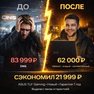 😤 До: DNS — 83 999 ₽ 😎 После: Yablock — 62 000 ₽ Игорь хотел игровой ноутбук. Зашёл в DNS — увидел ценник 83 999 ₽. Расстроился. Ушёл думать. Нашёл Yablock. Написал менеджеру. Получил тот же ASUS