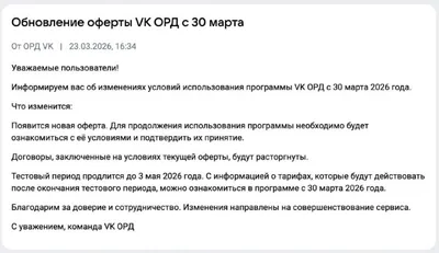 ОРД VK перейдет на платную модель с мая 2026 года ⚡️ Команда ОРД VK сообщила пользователям о переходе на платную модель. 30 марта появится информация о тарифах, а бесплатный период работы завершитс