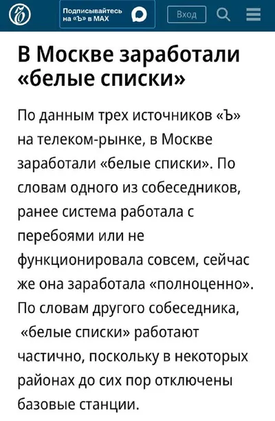 В Москве заработали «белые списки» сайтов В районах, где уже неделю нет мобильного интернета, заработали «белые списки» интернет-ресурсов, рассказал Ъ. Потестили в районе Якиманка. РБК и Ъ работают.
