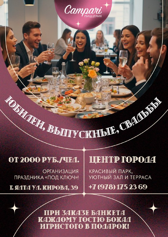 Юбилей, корпоратив, выпускной, свадьба — приглашаем вас провести ваше идеальное торжество в кафе «Campari» Мы предлагаем: ✅ локацию в центре Ялты на территории красивого парка; ✅ уютный зал с террас