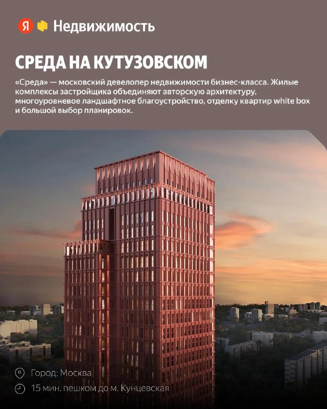 Выгода до 3 млн ₽ в ЖК Среда на Кутузовском 📌 Москва, ул. Ивана Франко м. Кунцевская 15 мин. пешком «Среда на Кутузовском» — жилой комплекс бизнес-класса западе столицы, неподалёку от Кутузовского