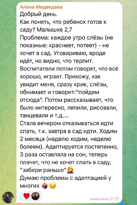Вы описываете ситуацию, которая очень часто встречается в период адаптации к детскому саду. По вашему рассказу я не вижу признаков того, что происходит что-то «не так». Отвечу сначала на главный вопр