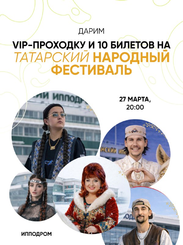 Дарим VIP-проходку и 10 билетов на Татарский народный фестиваль 27 марта Ипподром превратится в эпицентр татарской культуры и музыки. Хедлайнер вечера — Альфина Азгамова, та самая исполнительница хит