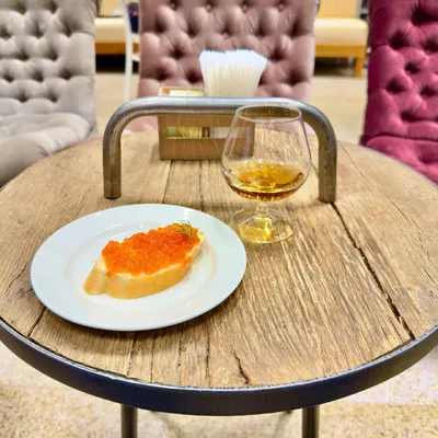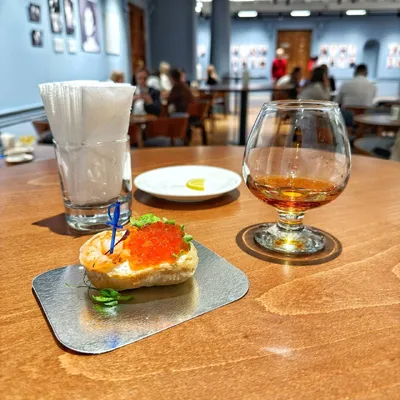 Бутерброд с красной икрой и креветкой по 600 ₽ и коньяк «Коктебель» по 400 ₽ за 40 мл в буфете Новосибирского академического драматического театра «Красный факел». К коньяку можно взять бонусом полов
