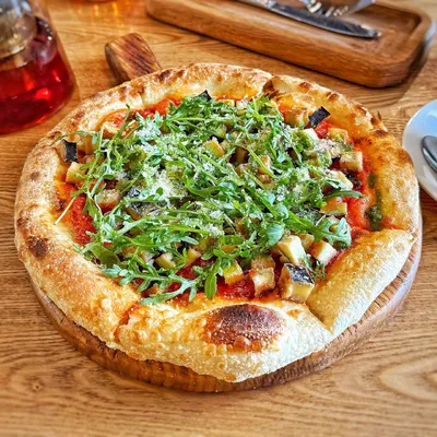 Пицца с баклажанами из «Лайт Меню» кафе «Перчини» по 470 ₽. Помечена в меню словом «пост». Эта пицца по сути — вариация популярного азиатского салата с тёплыми баклажанами в лёгкой панировке и с кис