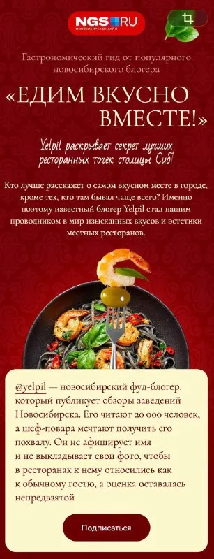 Еда и кулинарияГлавный гастрономический инфлюенсер Сибири 2025 Обзоры заведений Новосибирска. Выпил, съел, рассказал. На данный момент выпито на 91 467,95 ₽, съедено на 445 042,16 ₽. Личные сообщения и вопросы пишите сюда: @yelpil9 Ел / Пил