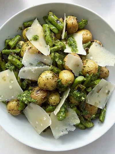 Понравился такой салат 🥬 Выглядит аппетитно и полезно👌делать легко: спаржа, запечённый бэйби картофель (или варёный и затем слегка обжаренный с чесноком и солью), соус песто, тонко нарезанный кози