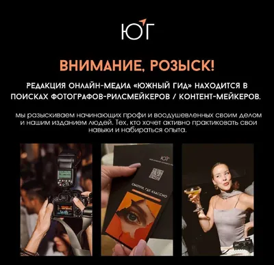 Внимание, розыск! Редакция онлайн-медиа «Южный гид» находится в поисках фотографов-рилсмейкеров / контент-мейкеров. Мы разыскиваем начинающих и воодушевленных своей работой и нашим изданием людей.