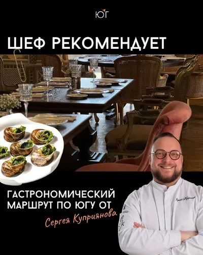 #Юг_ПьемЕдим Шеф рекомендует: гастрономический маршрут по Югу от Сергея Куприянова Шеф-повар ресторана при винодельне «Шато де Талю» Сергей Куприянов своих гостей знакомит с современной французской