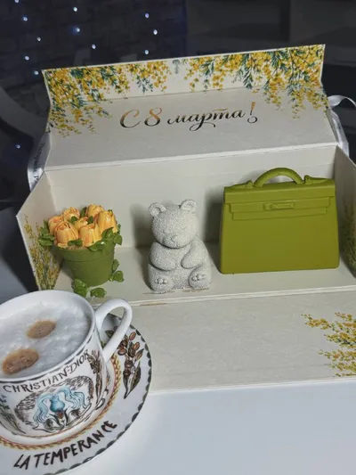 С 8 марта, девочки! Пусть в жизни будет больше поводов для радости. Мой день сегодня начался с очень красивых весенних десертов. Только посмотрите на эту «Шоколадную сумку», десерт тирамису «Мишка» и