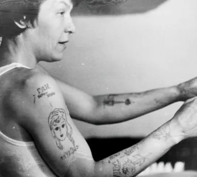 Женщина, отбывающая срок в тюрьме, 1997 год Была арестована на 13 лет за убийство мужа — зарезала его пока он спал, из-за того что он ей изменял. Татуировка "ГЛИ" на её плече означает "Говно любило
