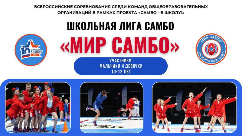 ШКОЛЬНАЯ ЛИГА САМБО «МИР САМБО» 🌟 Соревнования проводятся среди команд общеобразовательных организаций. Возраст участников: 10-12 лет ЭТАПЫ: ▪️ Школьный - до 1 февраля 2026; ▪️ Муниципальный - д