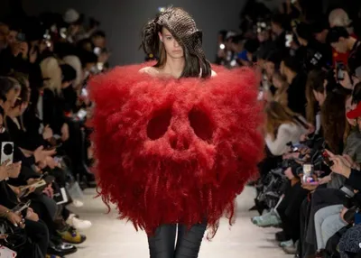 Noir Kei Ninomiya (дизайнерский бренд под эгидой Comme des Garçons) в коллекции FW26 показали шубку-отравленное яблоко из «Белоснежки». Как прикольно🍎