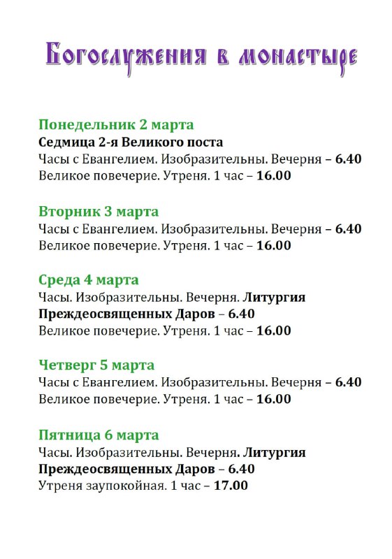 Расписание богослужений со 2 по 8 марта 2026 г. ЗАДОНСКИЙ МУЖСКОЙ МОНАСТЫРЬ