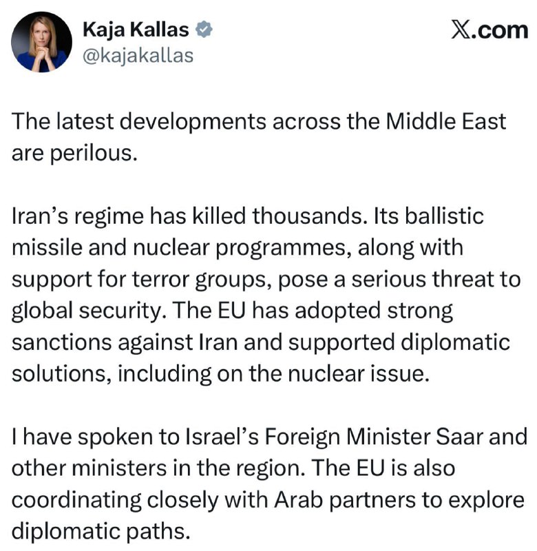 Пхаха, санкций, ожидаемо, не будет 🤣 ЕС по всей видимости не против ударов по Ирану.. Заместитель председателя Европейской комиссии Каллас поддержала США и Израиль, написав👇 Последние события на Бл