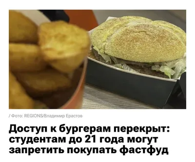 В России предложили продавать фастфуд только с 21 года С такой инициативой выступил Институт исследования проблем современной политики. Там считают, что регулярные бу��геры, картошка и прочий быстр