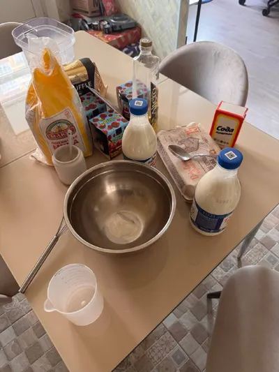 Нет времени объяснять! Рецепт блинов Катиной бабушки! 0,5л молока+ 0,5л горячей воды (её в самом конце) 2 яйца + 2 столовые ложки сахара -> растереть 1/3 чайной ложки соли на кончике ложки сода 2 ст