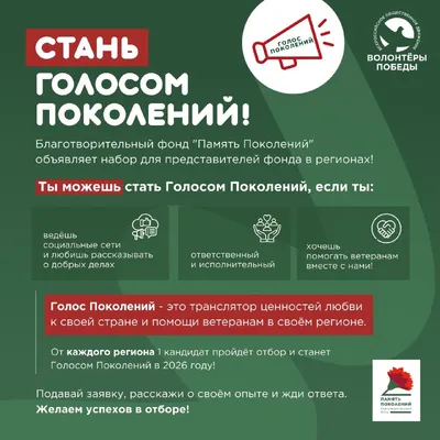 ⚡Волонтёры Победы, важная новость! У вас есть уникальная возможность стать «Голосом Поколений» Благотворительного фонда «Память поколений» в своём регионе! Фонд с 2015 года помогает ветеранам Велик