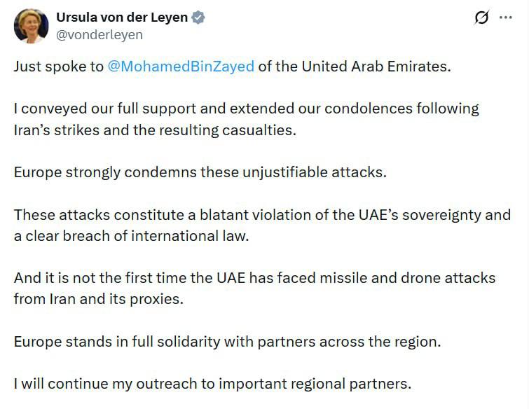 Урсула фон дер Ляйен вскукарекнула: Только что поговорила с Мохаммед бин Зайд аль-Нахайян из ОАЭ. Я выразила нашу полную поддержку и передала соболезнования в связи с ударами Ирана и возникшими жертв