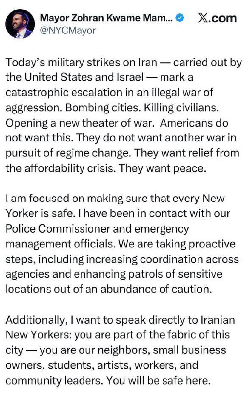 Мэр Нью-Йорка, демократ-социалист Зохран Мамдани раскритиковал удары США по Ирану. Он назвал их «катастрофической эскалацией» Сегодняшние военные удары по Ирану, нанесенные Соединенными Штатами и Изр