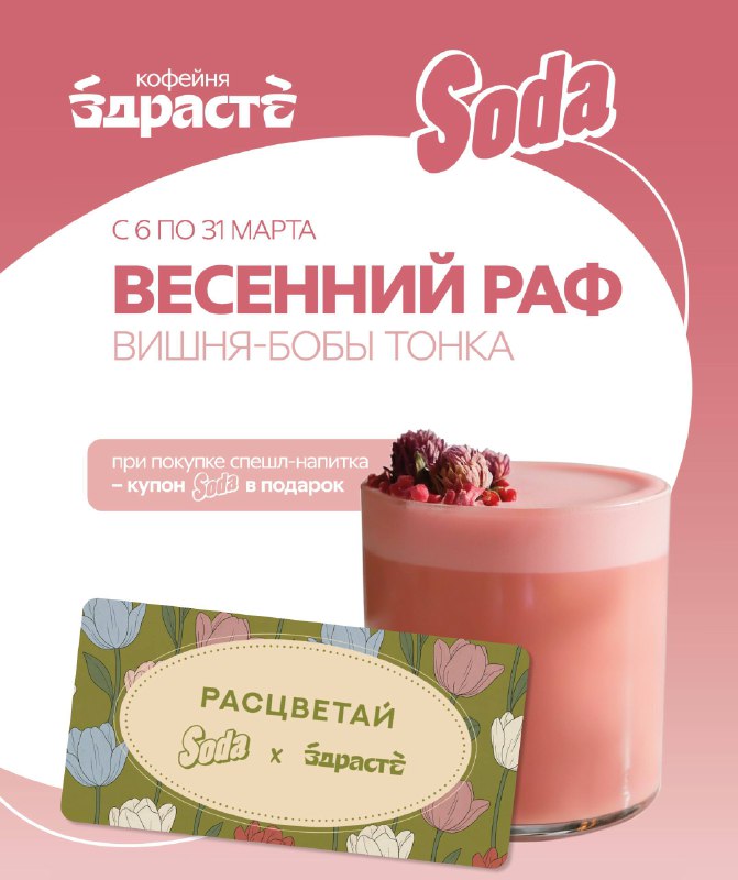Soda × «Здрасте» дарят сочные подарки к 8 марта! Наступила весна, а значит, пришло время для самой вкусной коллаборации! С 6 по 31 марта пробуйте наш спешл «Раф вишня-бобы тонка» во всех кофейнях М