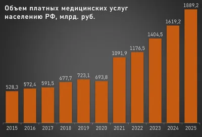 За последние 10 лет объем платных медицинских услуг населению России увеличился более чем в три с половиной раза. Очень устойчивый многолетний тренд. Объем расходов на платные медицинские услуги уже в