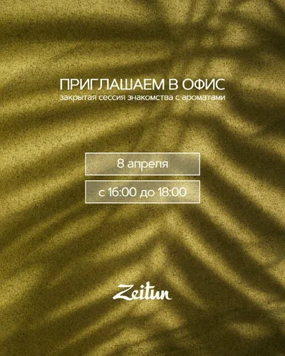 Ищем тех, кто чувствует Zeitun 💚 Приглашаем вас на закрытую сессию знакомства с ароматами в наш офис — будем вместе знакомиться с ароматами и тестировать новинки! 💧Когда: 8 апреля 💧Время: с 16:00