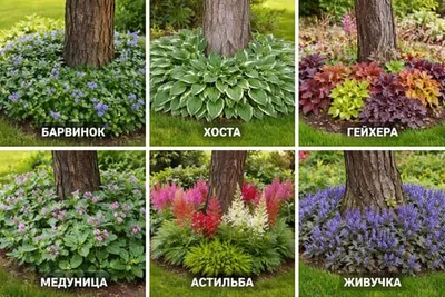 Что посадить под деревом? Красивый приствольный круг без вреда для корней 🌳🌼 🌱Барвинок. Быстро разрастается плотным ковром, закрывает почву и отлично удерживает влагу. 🌱Гейхера. Компактные кусти