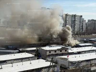 Пожар на стройрынке в Андреевке перекинулся на здание «Детского мира» Сейчас пожарные тушат здания с вышки, сообщает с места происшествия корреспондент «Зеленоград.ру». Вокруг собралось много людей.