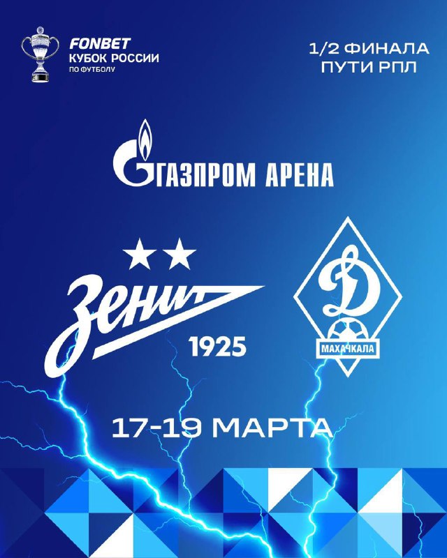 ⚡️⚡️ «Зенит» сыграет с махачкалинским «Динамо» на «Газпром Арене» в полуфинале Кубка России Пути регионов Матч состоится 17-19 марта, точная дата станет известна позже Дальше по сетке у этой пары пр