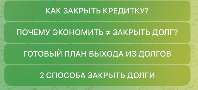 Выплатить долги помогут 4 инструкции от pro.finansy: 1. Как закрыть кредитку 2. Почему экономия = закрыть долг 3. Готовый план по выходу из долгов 4. 2 способа закрыть долги Переходите по ссылке,