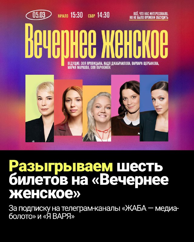 Вместе с Варей Щербаковой разыгрываем шесть билетов на «Вечернее женское». Это техническая вечеринка шоу, где ведущие обсуждают все, что произошло за последний месяц. Что сделать для участия в розыгр
