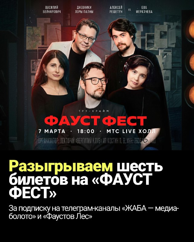 Разыгрываем шесть билетов на «Фауст фест» — масштабный тру-крайм фестиваль о феномене реальных преступлений, психиатрии и расследованиях, который пройдёт 7 марта в МТС Live Холл. Что сделать для учас