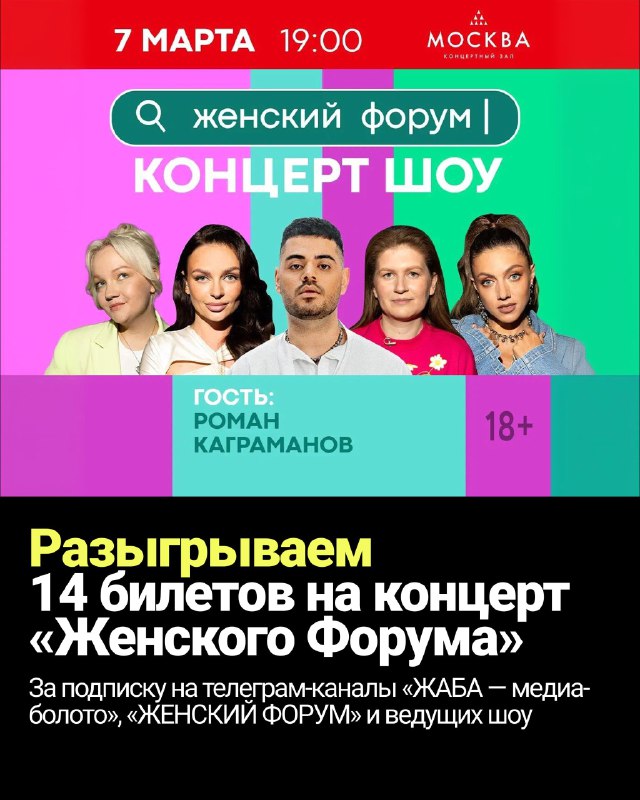В честь 8 марта разыгрываем 14 билетов на концерт «Женского форума» в Москве, который пройдет 7 марта в 19:00. Как участвовать в розыгрыше: 1. Подписаться на @zhabqua, @zhenforum, @natashaVshoke, @v