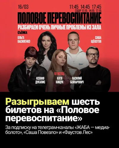 Разыгрываем билеты на шоу Ольги Василенко и Саши Щёкотова — «Половое перевоспитание». В гостях будут Ксения Дукалис, Катя Кищук, Василий Бейнарович. Как участвовать в розыгрыше: 1. Подписаться на @z