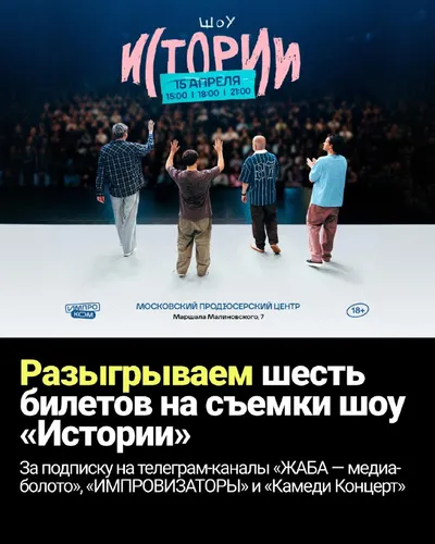 Хотите сходить на съемки шоу «Истории» 15 апреля? Мы разыгрываем шесть билетов! Как участвовать в розыгрыше: 1. Подписаться на тг-каналы @zhabqua, @comedyconcert, @theimprovisatorsshow 2. Нажать на