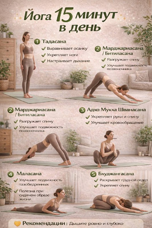 Мягкий комплекс асан для ежедневной практики (10–20 минут), который подойдёт для поддержания гибкости, осанки и спокойствия. 1. Тадасана ✔ Выравнивает осанку ✔ Укрепляет ноги ✔ Настраивает дыхание С