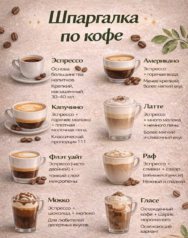 Шпаргалка по самым популярным видам кофе ☕ Эспрессо Основа большинства напитков. Крепкий, насыщенный, 30–40 мл. ☕ Американо Эспрессо + горячая вода. Менее крепкий, более мягкий вкус. ☕ Капучино Эсп