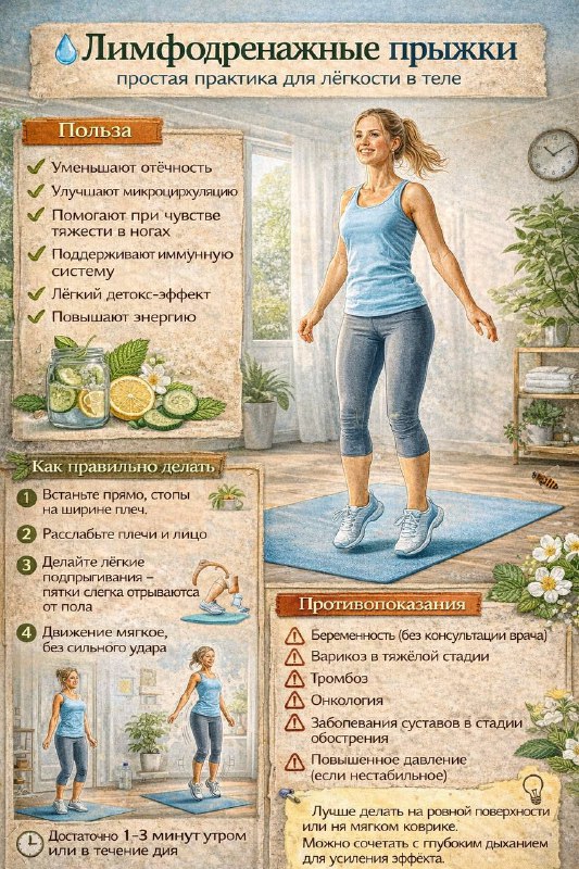Лимфодренажные прыжки — простая практика для лёгкости в теле. Лимфодренажные прыжки — это мягкие, невысокие подпрыгивания на месте, которые помогают активизировать движение лимфы. В отличие от крови,